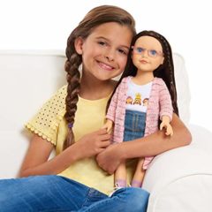 Click for More Images An 18” Truly Me doll with brown eyes that open and close smoothly. Her long curly black hair—the first introduction of this curl style for American Girl—is styled with a crystal-adorned golden metal headband. She comes...